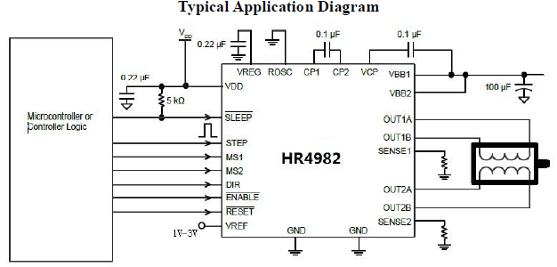 HR4988是一種便于使用的內(nèi)部集成了譯碼器的微特步進(jìn)電機(jī)驅(qū)動器。其設(shè)計為能使雙極步進(jìn)電機(jī)以全、半、1/4、1/8、1/16、1/32、1/64和1/128步進(jìn)模式工作。步進(jìn)模式由邏輯輸入MSx選擇。輸出驅(qū)動能力達(dá)到35V和±2A。HR4988包含一個工作在慢衰或混合衰減模式的固