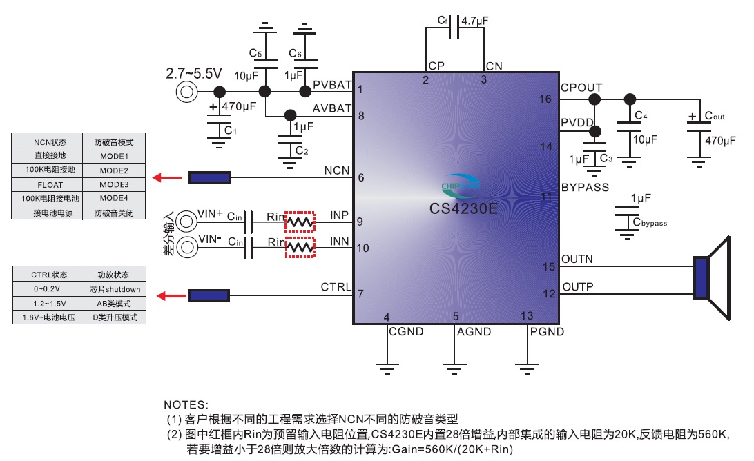 CS4230E是一款采用 CMOS工藝 ,電窯式升壓型 GF類單 聲道音頻功放,可以為4Ω的負(fù)載O供最高4.8W的連續(xù)功 率;CS4230E芯片內(nèi)部固定的28倍增益,有效的減少了 外圍元器件的數(shù)量;功放集成了D類和AB類兩種工作模式 即可保證D類模式下強(qiáng)勁的功率輸出,又可兼顧系統(tǒng)在有 FM的情況下,消除功放對(duì)系統(tǒng)的干擾;CS4230E具有獨(dú) 特的防破音(NCN)功 能,可根據(jù)輸出信號(hào)的大小自動(dòng)調(diào)整 功放的增益,實(shí)現(xiàn)更 舒適的昕覺感受,其4種防破音模式 的選擇為不同的工程要求O供了最大的挑選余地 ;另 外,CS4230E還具備電源自適應(yīng)能力,當(dāng)電源電壓低的時(shí) 候,功放會(huì)自動(dòng)降低增益,從而減少功放的輸出功率.