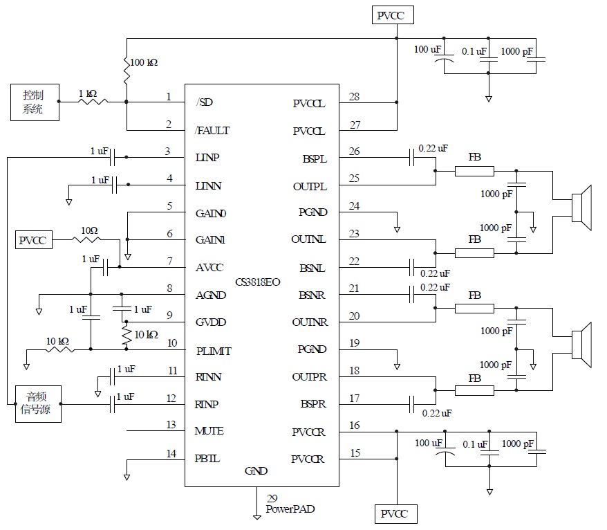 CS3818可以驅(qū)動(dòng)低至4Ω 負(fù)載的立體聲揚(yáng)聲器,具有高達(dá)90%的效率,使得在播放音樂(lè)時(shí)不需要額外的散熱器。