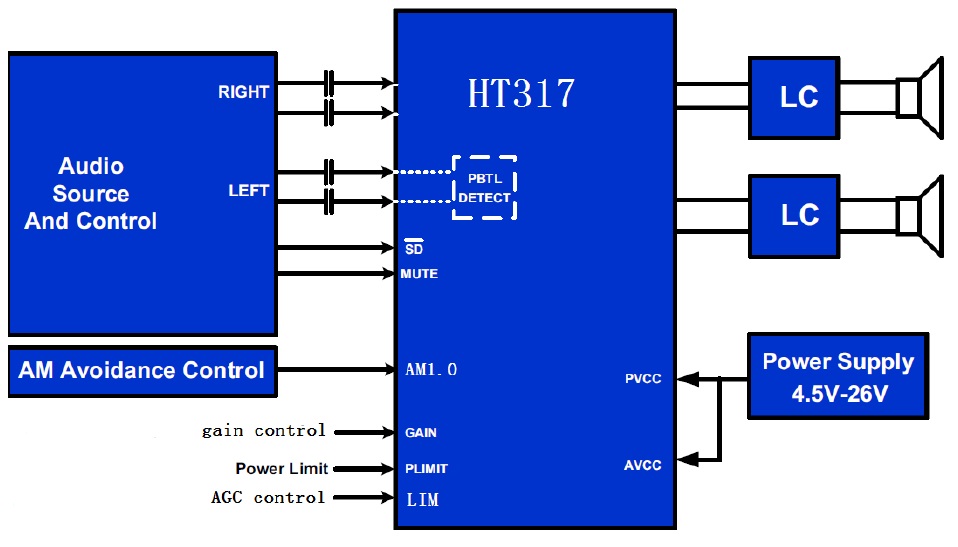 HT317是一款高效D類音頻功率放大器。在BTL模式,能夠提供2*30W/8Ω功率輸出;在PBTL模式,能夠提供75W/4Ω功率輸出。