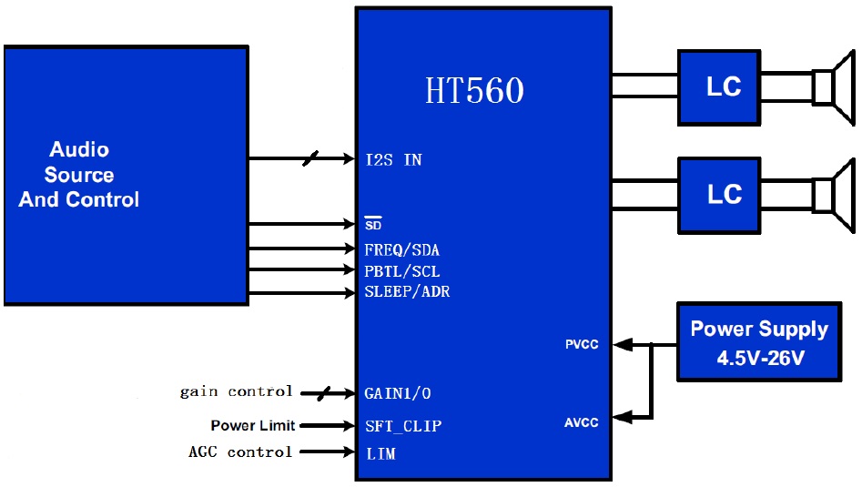 HT560是一款高效I2S輸入D類立體聲音頻功率 放大器。HT560可選硬件或者軟件I2C控制。在BTL 模式,能夠提供2*30W/8Ω功率輸出;在PBTL模式, 能夠提供75W/4Ω功率輸出。