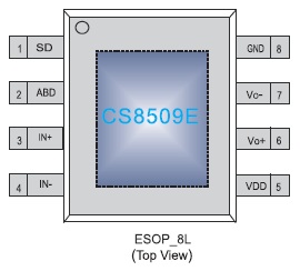 CS8509E提供了纖小的ESOP8L封裝類型供客戶選擇,其額定的工作溫度范圍為-40℃至85℃。
