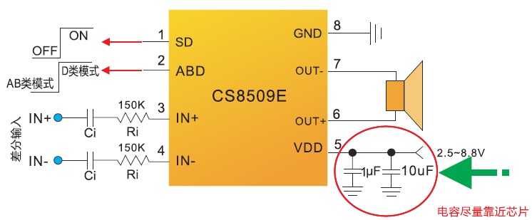 CS8509E的全差分架構(gòu)和極高的PSRR有效地提高了對(duì)RF噪聲的抑制能力,并且省去了傳統(tǒng)音頻功放的BYPASS電容。