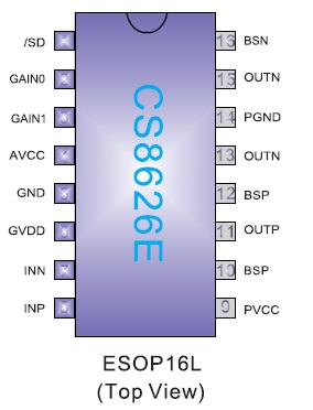 CS8626E提供纖小的ESOP16封裝形式供客戶選擇,可以為客戶節(jié)省可觀的PCB面積,其額定的工作溫度范圍為-40℃至85℃。