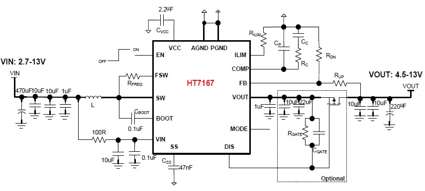 HT71672是一款高功率、全集成升壓轉(zhuǎn)換器,輸入電壓范圍VIN:2.7V-13V ;輸出電壓范圍VOUT:4.5V-13V ;可編程峰值電流:12A |