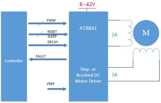 AT8841為打印機和其它電機一體化應(yīng)用提供一種雙通道集成電機驅(qū)動方案。AT8841有兩路H橋驅(qū)動,最大輸出42V 3A,可驅(qū)動兩路刷式直流電機,或者一路雙極步進電機,或者螺線管或者其它感性負載。雙極步進電機可以以整步、2細分、4細分運行,或者用軟件實現(xiàn)高細分。 |
