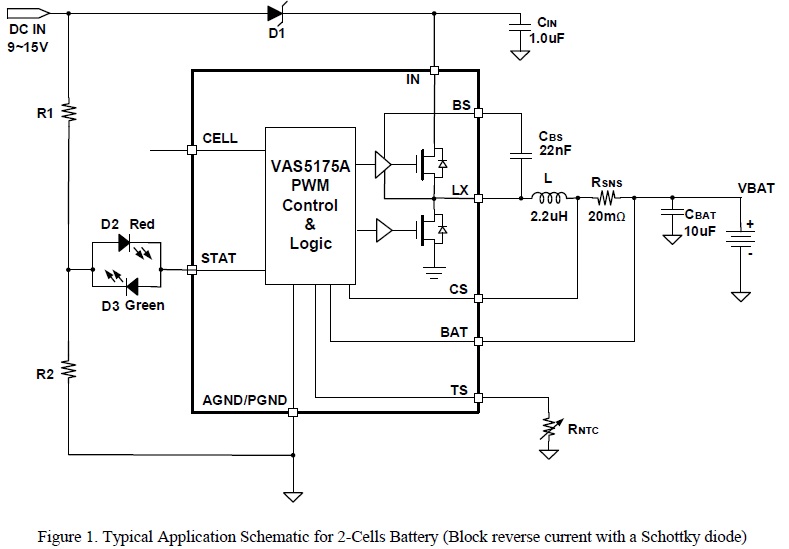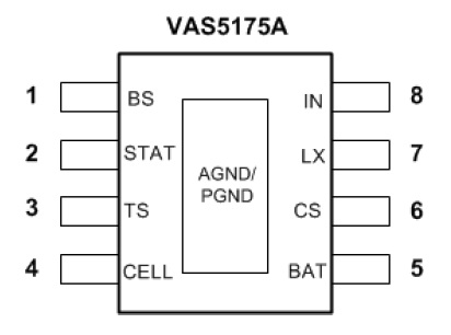 VAS5175H 是一款5V-24V 輸入,開關(guān)降壓型1節(jié)4.35V/2節(jié)8.7V鋰離子/聚合物電池充電芯片, 以高精度調(diào)節(jié)2A 充電電流,和電池電壓。它密切監(jiān)測電池組的溫度只在設置安全溫度范圍下允許充電,還提供電池檢測、預充電調(diào)節(jié)、充電飽充和充電狀態(tài)指示等功能。 |