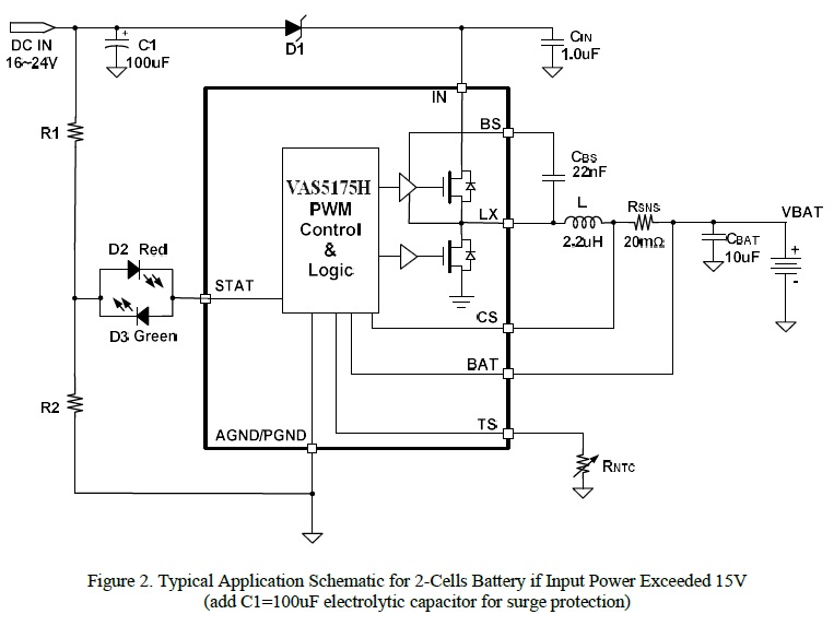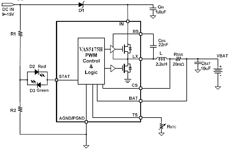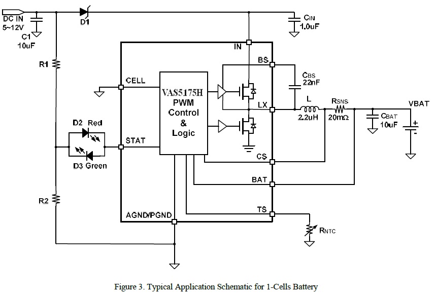 VAS5175H 是一款5V-24V 輸入,開關(guān)降壓型1節(jié)4.35V/2節(jié)8.7V鋰離子/聚合物電池充電芯片, 以高精度調(diào)節(jié)2A 充電電流,和電池電壓。它密切監(jiān)測電池組的溫度只在設(shè)置安全溫度范圍下允許充電,還提供電池檢測、預(yù)充電調(diào)節(jié)、充電飽充和充電狀態(tài)指示等功能。 |