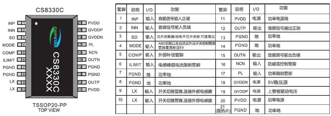 CS8330C提供了纖小的的TSSOP20-PP封裝形式供客戶選擇,其額定的工作溫度范圍為-40℃至85℃。