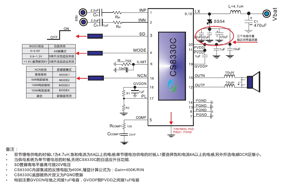當前位置:首頁->產品展示->功放IC->CS8330(單節(jié)鋰電/12V適配器雙電源供電、內置升壓15W單聲道音頻功放IC) |