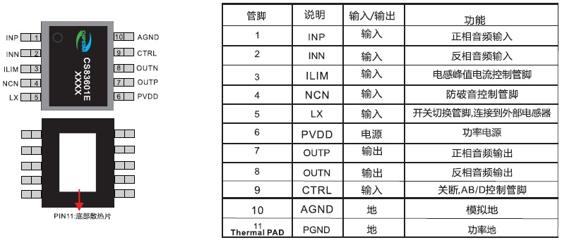 CS83601(內(nèi)置BOOST升壓模塊、單節(jié)鋰電恒定11W功率單聲道AB/D類切換音頻功放IC) |