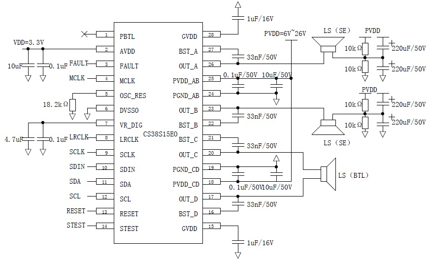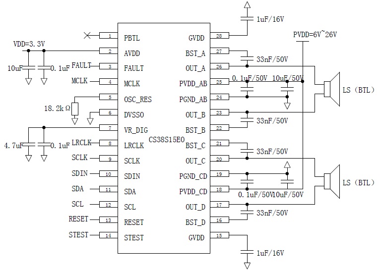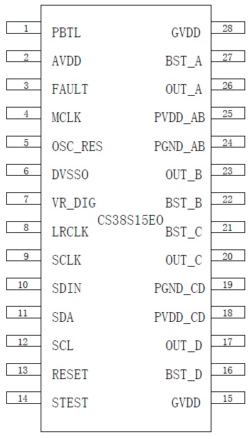 CS38S15 具備4 個(gè)獨(dú)立通道輸出(SE×4),每個(gè)通道典型輸出功率為8W,可以組成2.0 聲道模式(BTL×2,典型值15W×2),2.1 聲道模式(BTL×1+SE×2,典型值15W+8W×2),1.0 聲道模式(PBTL×1,典型值30W×1)