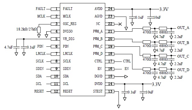 CS3Q01 具備 4 通道 PWM 輸出可以驅(qū)動 PWM 輸入功放電路,也可以濾波后驅(qū)動耳機或者模擬輸入功放,其特點如下:
