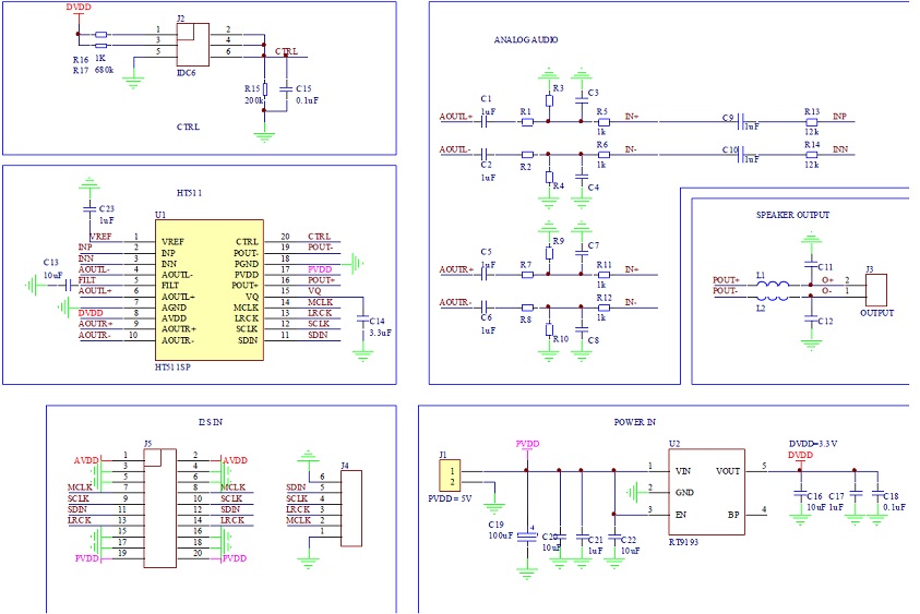 HT511內(nèi)部集成了DA轉(zhuǎn)換器,其I2S輸入最大支持 24-bit字節(jié) ,并且可自動(dòng)監(jiān)測(cè)采樣頻率,最高支持 192kHz。