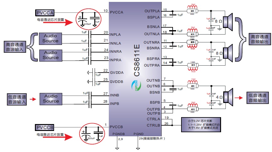 CS8611E內(nèi)置了過流保護(hù),短路保護(hù)和過熱保護(hù),有效的保護(hù)芯片在異常的工作條件下不被損壞。在供電電源小于16.0V的情況下,CS8611E可以驅(qū)動(dòng)一個(gè)4Ω 的低音喇叭和2個(gè)8Ω高音喇叭,整體音頻子系統(tǒng)具有高達(dá)90%的效率,使得在播放音樂的時(shí)候不需要額外的散熱器。