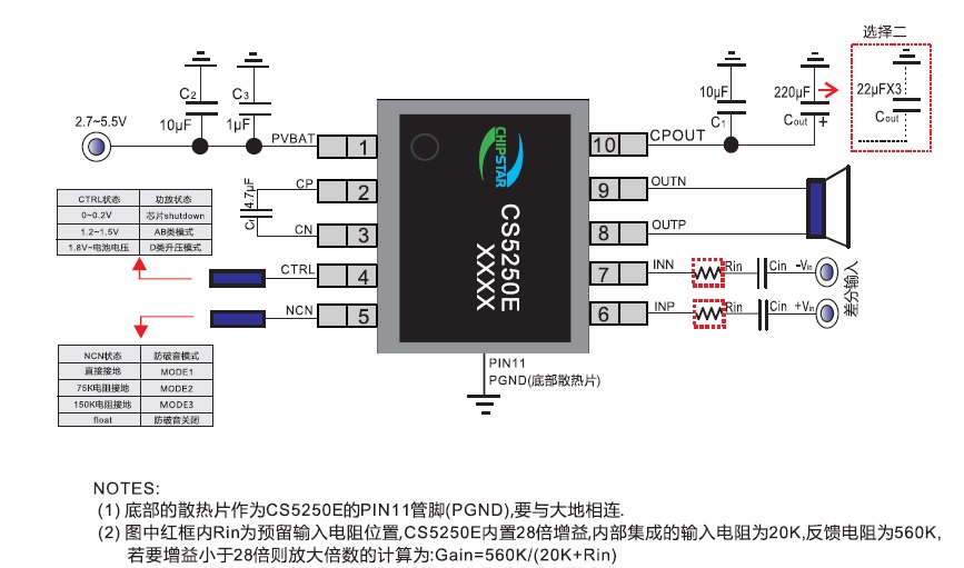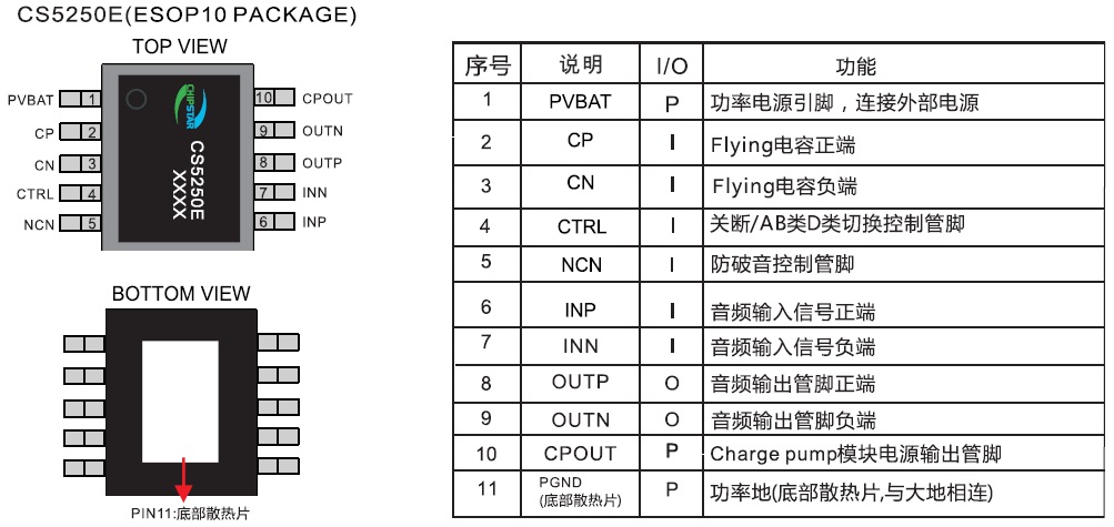 CS5250E提供了ESOP10的封裝類型,其額定的工作溫度范圍為-40℃至85℃。