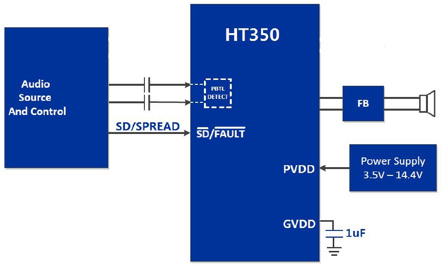 HT350是一款高效D類音頻功率放大器。在15V供電的單聲道(PBTL)模式下,能夠持續(xù)提供30W/4Ω功率輸出。