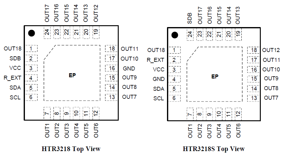HTR3236是一款36路LED PWM驅(qū)動(dòng)器,PWM頻率可固定為3kHz或22kHz。每一路最大輸出電流可通過(guò)外置電阻REXT調(diào)節(jié),最大38mA,并