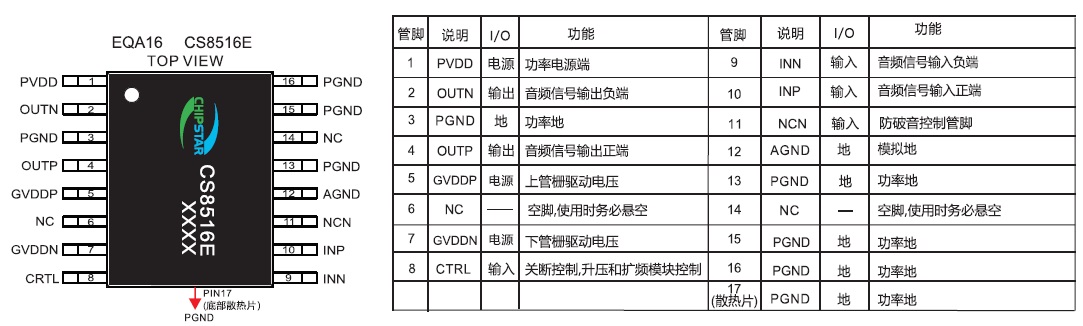 CS8516E提供了纖小的的EQA16封裝形式供客戶選擇 ,封裝尺寸和ESOP8一致, 其額定的工作溫度范圍為-40℃至85℃。