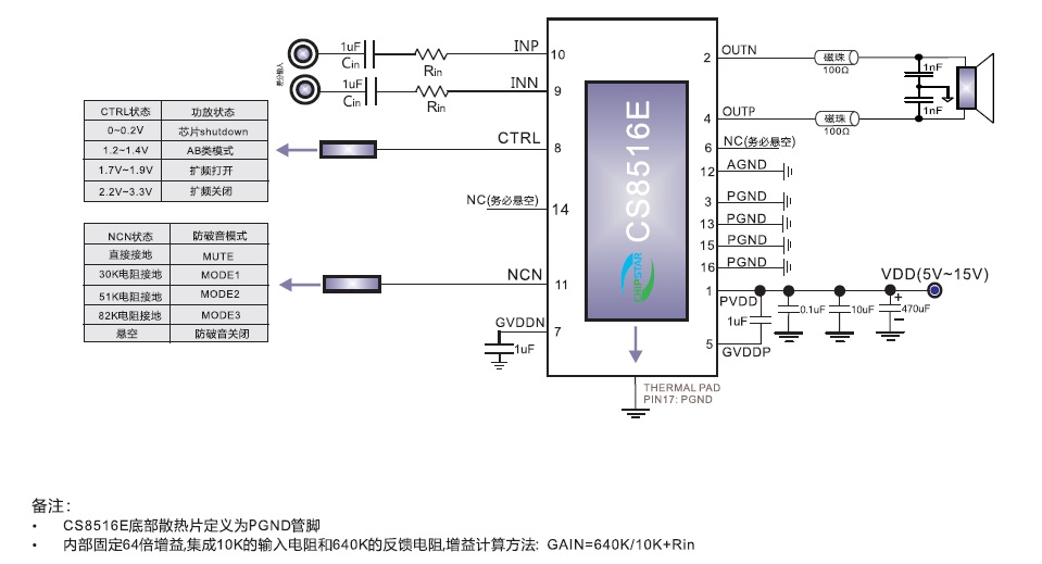 CS8516(應(yīng)用于收音機(jī)的5V-15V寬電壓AB/D類切換功能30W貼片單聲道音頻功放IC) |