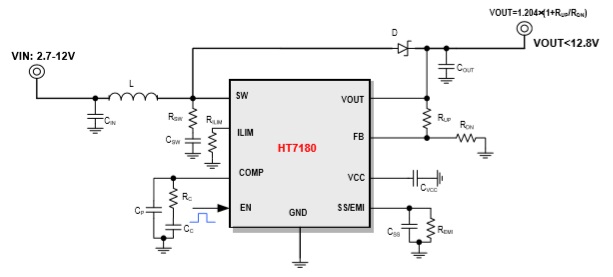 HT7180是一款高功率異步升壓轉(zhuǎn)換器,集成 22mΩ功率開關(guān)管,為便攜式系統(tǒng)提供高效的 小尺寸解決方案。 HT7180具有2.7V至12V寬輸入電壓范圍,可為 采用單節(jié)或兩節(jié)鋰電池的應(yīng)用提供支持。該器 件具備10A開關(guān)電流能力,并且能夠提供高達(dá) 12.8V的輸出電壓。 HT7180還支持可編程的軟啟動,以及可調(diào)節(jié)的 開關(guān)峰值電流限制。HT7180還支持兩種不同的 tr/tf,以適應(yīng)不同的EMI和效率需求。 此外,該器件還提供有13V輸出過壓保護(hù)、和熱 關(guān)斷保護(hù)。
