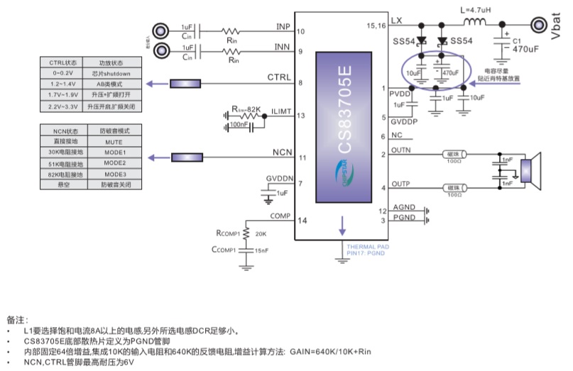 CS83705E的全差分架構(gòu)和極高的PSRR有效地提高對(duì)RF噪聲的抑制能力。無需濾波器的PWM調(diào)制結(jié)構(gòu)及內(nèi)置的BOOST升壓模塊,以及CS83705E采用專有的AERC((Adaptive Edge Rate Control)技術(shù),在音頻全帶寬范圍內(nèi)極大地降低了EMI的干擾,對(duì)60cm的音頻線,在FCC的標(biāo)準(zhǔn)下具有超過20dB的裕量,另外CS83705E內(nèi)置了過流保護(hù),短路保護(hù)和過熱保護(hù),有效的保護(hù)芯片在異常的工作條件下不被損壞。