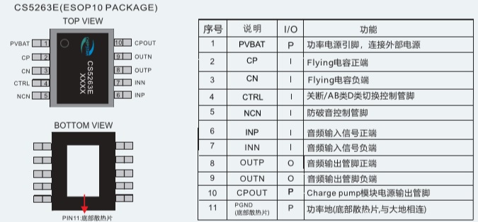 CS5263E提供了ESOP10的封裝類型,其額定的工作溫度范圍為-40℃至85℃。