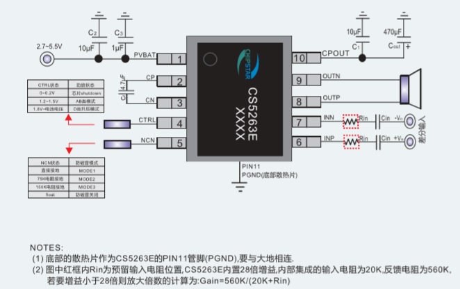 CS5263E是一款采用CMOS工藝,電容式升壓型GF類單聲道音頻功放,可以為3Ω的負載提供最高7W的連續(xù)功率;CS5263E芯片內(nèi)部固定的28倍增益,有效的減少了外圍元器件 的數(shù)量;功放集成了D類和AB類兩種工作模式即可保證D類模式下強勁的功率輸出,又可兼顧系統(tǒng)在有FM的情況下,消除功放對系統(tǒng)的干擾;CS5263E具有獨特的防破音(NCN)功 能,可根據(jù)輸出信號的大小自動調(diào)整功放的增益,實現(xiàn)更加舒適的聽覺感受. CS5263E的外圍只有低成本的阻容器件,在以鋰電池供電的移動式音頻設(shè)備中,CS5263E是理想的音頻子系統(tǒng)的功放解決方案.CS5263E的全差分架構(gòu)和極高的PSRR有效地提高了CS5263E對RF噪聲的抑制能力。另外CS5250E內(nèi)置了過流保護和過熱保護,有效的保護芯片在 異常的工作條件下不被損壞。