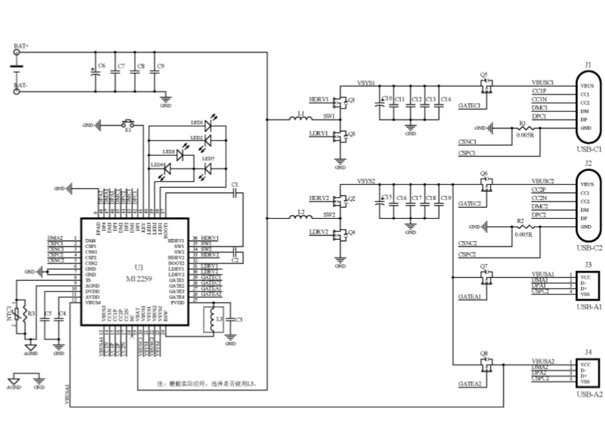 M12239是一款面向雙路獨(dú)立的多電芯大功率移動(dòng)電源應(yīng)用的專(zhuān)用 SOC,集成了同步升降壓變換器、電池 充放電管理模塊、顯示模塊、電量計(jì)算模塊,提供最大 140W 輸入/輸出功率,支持 PD3.1、QC3.0、AFC、FCP、SCP、BC1.2 DCP 等主流快充協(xié)議,并提供過(guò)壓/欠壓、過(guò)充/過(guò)放、過(guò)溫等完備的保護(hù)功能。配合極簡(jiǎn)的外圍 電路,即可組成單 C口大功率移動(dòng)電源。輔以DC-DC芯片,可以擴(kuò)展為3-8串電池雙路獨(dú)立的多口大功率移動(dòng)電源。 |