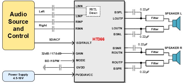 HT366(具有防破音功能的2×20W立體聲D類音頻功放IC) |