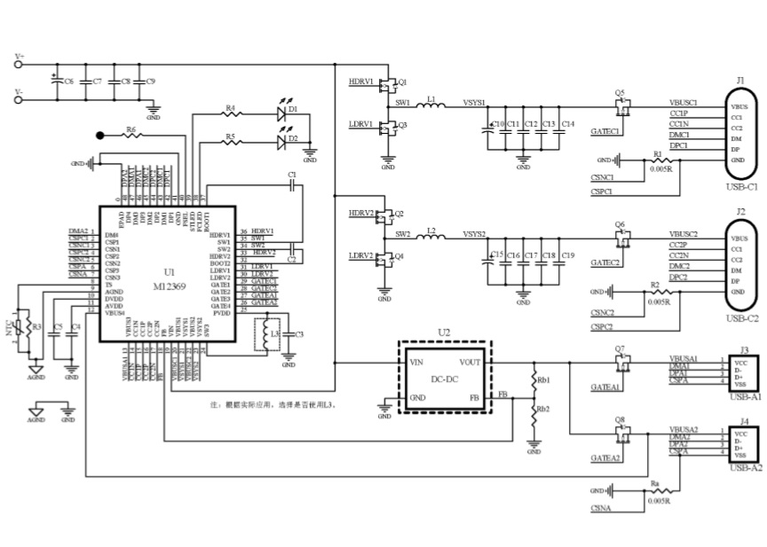 M12239是一款面向雙路獨(dú)立的多電芯大功率移動(dòng)電源應(yīng)用的專用 SOC,集成了同步升降壓變換器、電池 充放電管理模塊、顯示模塊、電量計(jì)算模塊,提供最大 140W 輸入/輸出功率,支持 PD3.1、QC3.0、AFC、FCP、SCP、BC1.2 DCP 等主流快充協(xié)議,并提供過壓/欠壓、過充/過放、過溫等完備的保護(hù)功能。配合極簡(jiǎn)的外圍 電路,即可組成單 C口大功率移動(dòng)電源。輔以DC-DC芯片,可以擴(kuò)展為3-8串電池雙路獨(dú)立的多口大功率移動(dòng)電源。 |