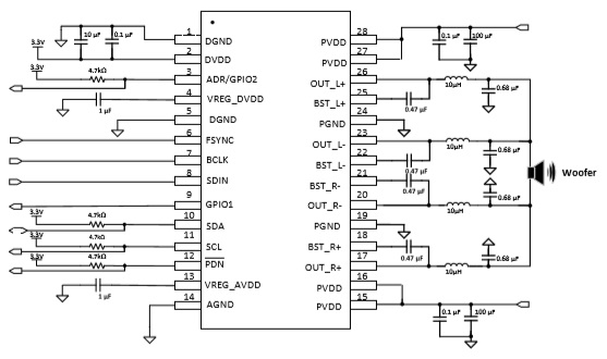 I2S數(shù)字輸入33W立體聲D類音頻功放芯片、內(nèi)置DSP小音量低頻增強(qiáng)等算法 |