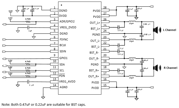 - 供電電壓范圍 PVDD: 4.5V to 21V