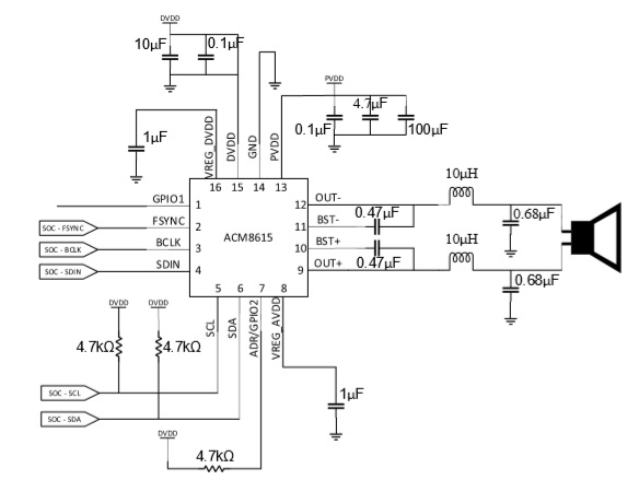ACM8615一款高度集成、高效率的單通道數(shù)字輸入功放。供電電壓范圍在 4.5V-21V,數(shù)字電源是 3.3V或者1.8V。在 8 歐負載下,輸出功率1×21W @1% THD+N.