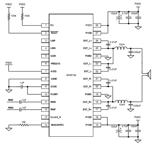 ACM3129A 在4Ω負載下可以輸出立體聲2X57W,或者單通道2Ω負載下輸出1X110W,失真度都是THD+N=1%的條件下測試。ACM3129A 是一款高效率的D類音頻功放。采用新型專利技術(shù)動態(tài)PWM,降低全輸出段的功耗。 ACM3129A工作電壓范圍在4.5-26.4V,輸出配置可以立體聲BTL,也可以單通道PBTL。為降低EMI 噪聲,ACM3129A提供了兩個頻率的展頻選項 (384kHz, 480kHz),在一定條件下可以免電感。 ACM3129A還提供了全差分輸入,pop音抑制,提供 4 種增益選擇等功能(20dB,26dB,30dB and 34dB)。