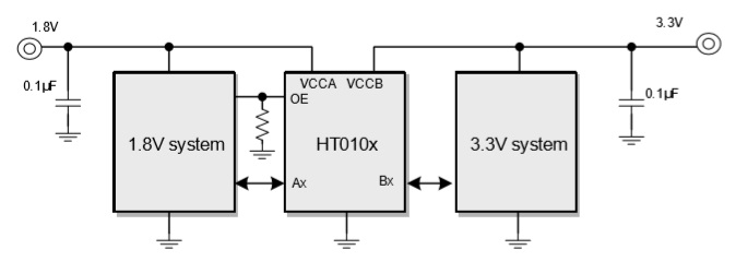HT0101是一款1路雙向電平轉換器,其使用兩個獨立的供電VCCA和VCCB。電壓較低的電平信號接入A端口,支持1.65V~5.5V電壓,其對應VCCA; 電壓較高的電平信號接入B端口,支持2.3V~5.5V電壓,其對應VCCB。 |