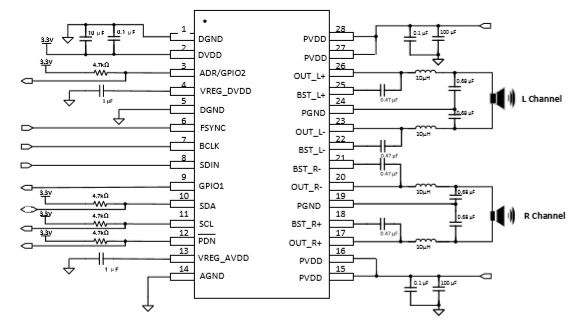 - 供電電壓范圍PVDD: 4.5V to 26.4V