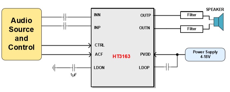 HT3163具有防削頂失真(ACF)輸出控制 功能,可檢測(cè)并抑制由于輸入音樂、語(yǔ)音信號(hào) 幅度過大所引起的輸出信號(hào)削頂失真(破音), 也能自適應(yīng)地防止在電源電壓下降所造成的輸 出削頂,顯著提高音質(zhì),創(chuàng)造非常舒適的聽音 享受,并保護(hù)揚(yáng)聲器免受過載損壞。