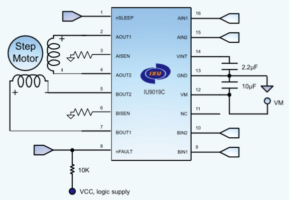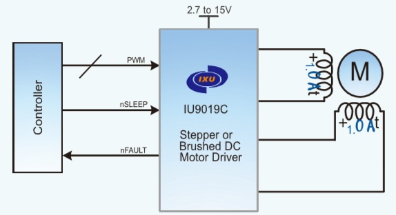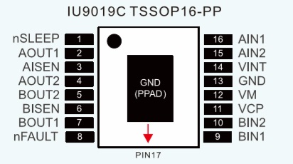 IU9019C為玩具、打印機和其它電機一體化應用提供一種雙通道電機驅動方案。IU9019C有兩路H橋驅動,可以驅動兩路刷式直流電機,一個雙極步進電機,多個螺線管或者其它感性負載。每個H橋的功率輸出模塊由N溝道功率MOSFET組成,用于驅動電機繞組。每個H 橋均具備調節(jié)或限制繞組電流的電路。該器件利用故障輸出引腳實現內部關斷功能,提供過流保護、短路保護、欠壓鎖定和過熱保護,并提供了一種低功耗休眠模式。另外提供一個錯 誤輸出管腳nFAULT,當過流過溫保護的時候,nFAULT為低電平.