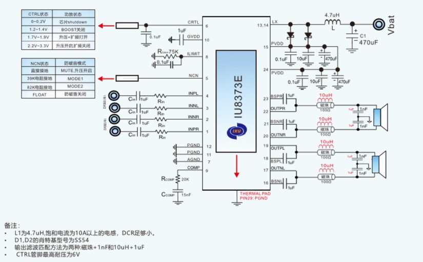 IU8373(兩節(jié)鋰電8.4V供電內(nèi)置升壓20W立體聲D類功放IC) |