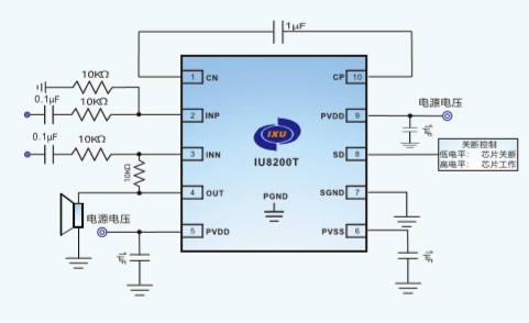 IU8200T是一款支持差分輸入,支持大動態(tài)輸入信號300mW單聲道高性能音頻驅(qū)動芯片,專為電路板空間有限的便攜設(shè)備而設(shè)計。IU8200T采用單端模式輸出,其直驅(qū)模式結(jié)構(gòu)單電源供電時能夠產(chǎn)生以地為參考的輸 出,從而省去了大尺寸的隔直電容,既節(jié)省了成本和電路板空間,也降低了元件的高度。IU8200T可向16Ω負載提供高達300mW輸出功率, THD+N僅為0.006%。217Hz時具有86dB的高電源抑制比(允許該器件工作在嘈雜的數(shù)字電源,無需額外的線性穩(wěn)壓器件)。精巧的咔嗒聲抑制電路消除了啟動與關(guān)斷過程中的可聞噪聲。低功耗關(guān)斷控制, 可以在混聽模式有效的節(jié)省能源。IU8200T工作電壓范圍在2.5V-5.5V,待機時僅消耗3.2mA電源電流,具有短路保護與熱過載保護。IU8200T封裝形式為DFN2X2_10L,其額定的工作溫度范圍為-40℃至85℃。