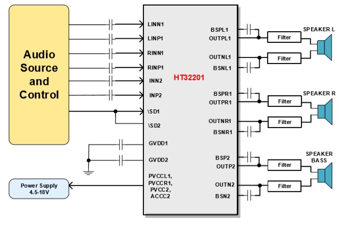 HT32201是一款高效的2.1聲道D類音頻功率放大器。在14.5V供電,能夠持續(xù)提供30W/4Ω +2×15W/8Ω的功率輸出。