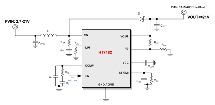 HT7182具有2.7V至21V寬輸入電壓范圍,可為采用1-4節(jié)鋰電池,或12V鉛酸電池的應(yīng)用提供支持。該器件具備14A開(kāi)關(guān)電流能力,并且能夠提供高達(dá)21V的輸出電壓。