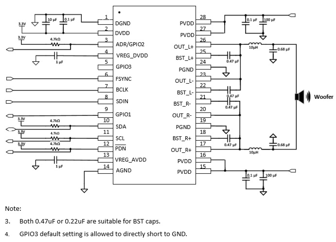 I2S數(shù)字輸入33W立體聲D類(lèi)音頻功放芯片、內(nèi)置DSP小音量低頻增強(qiáng)等算法 |