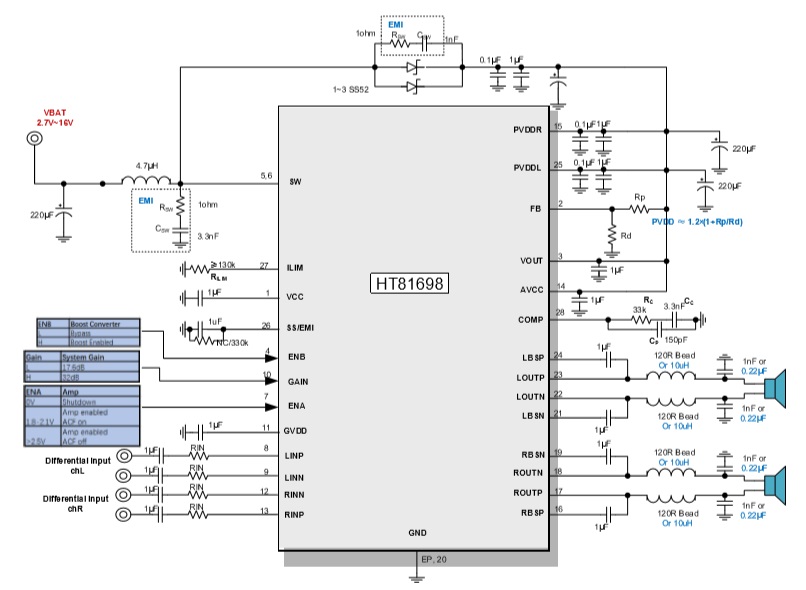 此外,HT81698內(nèi)部集成免濾波器調(diào)制技術(shù), 能夠直接驅(qū)動(dòng)揚(yáng)聲器,內(nèi)置的關(guān)斷功能使待機(jī) 電流最小化,還集成了輸出端過(guò)流保護(hù)、片內(nèi) 過(guò)溫保護(hù)、輸入電源欠壓異常保護(hù)、升壓電壓 過(guò)壓保護(hù)等功能。