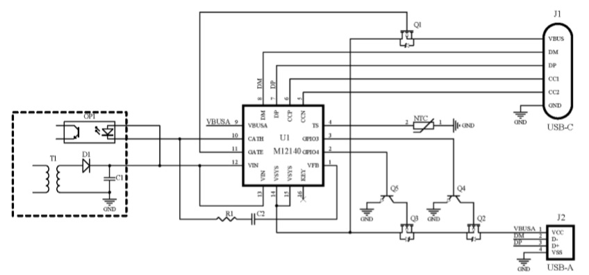 M12150是一款支持PD3.1的雙口全兼容快充協(xié)議IC,集成了微處理器、USB Type-C 接口、快充協(xié)議控制器、高精度電流采樣電阻,支持DFP/Source功能。利用TL431和光耦組成的反饋電路調(diào)整前級AC-DC的輸出電壓,搭載極少的元件可以組成C口協(xié)議調(diào)壓、A口降壓的 C+A獨立雙口功率可分配的快充解決方案。 |