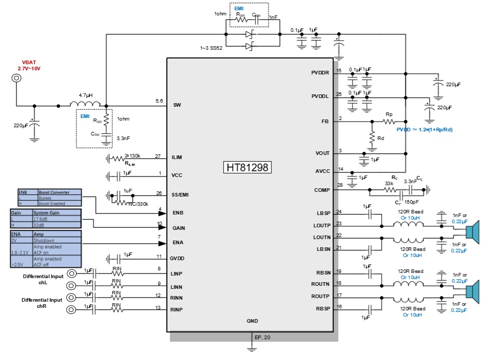 此外,HT81298內(nèi)部集成免濾波器調(diào)制技術(shù),能夠直接驅(qū)動(dòng)揚(yáng)聲器,內(nèi)置的關(guān)斷功能使待機(jī) 電流最小化,還集成了輸出端過(guò)流保護(hù)、片內(nèi)過(guò)溫保護(hù)、輸入電源欠壓異常保護(hù)、升壓電壓 過(guò)壓保護(hù)等功能。