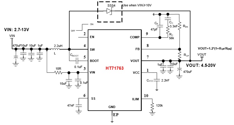 HT71763具有2.7V至20V寬輸入電壓范圍, 可為采用單節(jié)或兩節(jié)鋰電池的應(yīng)用提供支持。該器件具備15A開(kāi)關(guān)電流能力,并且能夠提供20V的輸出電壓。
