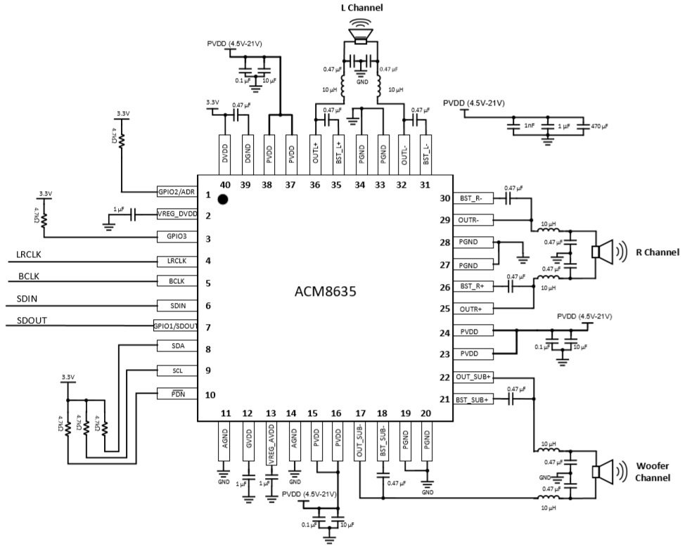 ACM8635一款2.1通道數(shù)字輸入音頻功率放大器。供電電壓范圍在4.5V-21V。在2.1通道工作模式, 2 x 6歐+4歐負載下,輸出功率可以達到2×24W+40W ; 在雙聲道工作模式,2x4歐負載下,輸出功率可以達到2×42W。