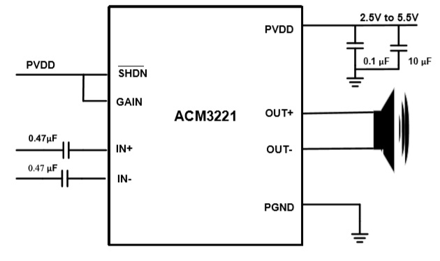 主動跟蹤限制、邊緣速率和超調(diào)控制電路大大降低了EMI。無濾波器擴頻調(diào)制方案消除了對傳統(tǒng)D類設(shè)備中的輸出濾波器的必須配備。這些功能大大簡化了外圍應(yīng)用,節(jié)省PCB面積。ACM3221在3.7V時靜態(tài)功耗<1.2mA(5V時約1.5mA),超低靜態(tài)電流延長便攜式電池的壽命應(yīng)用。